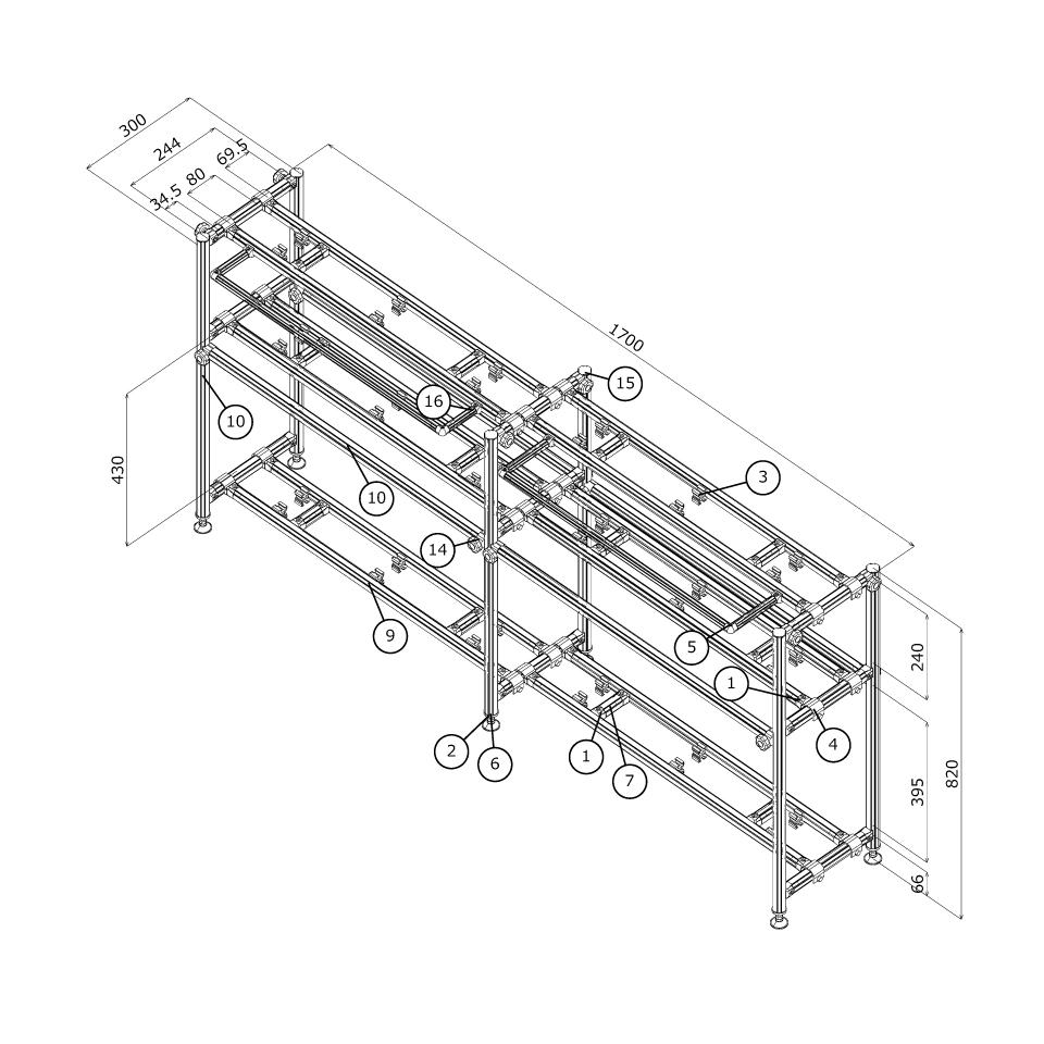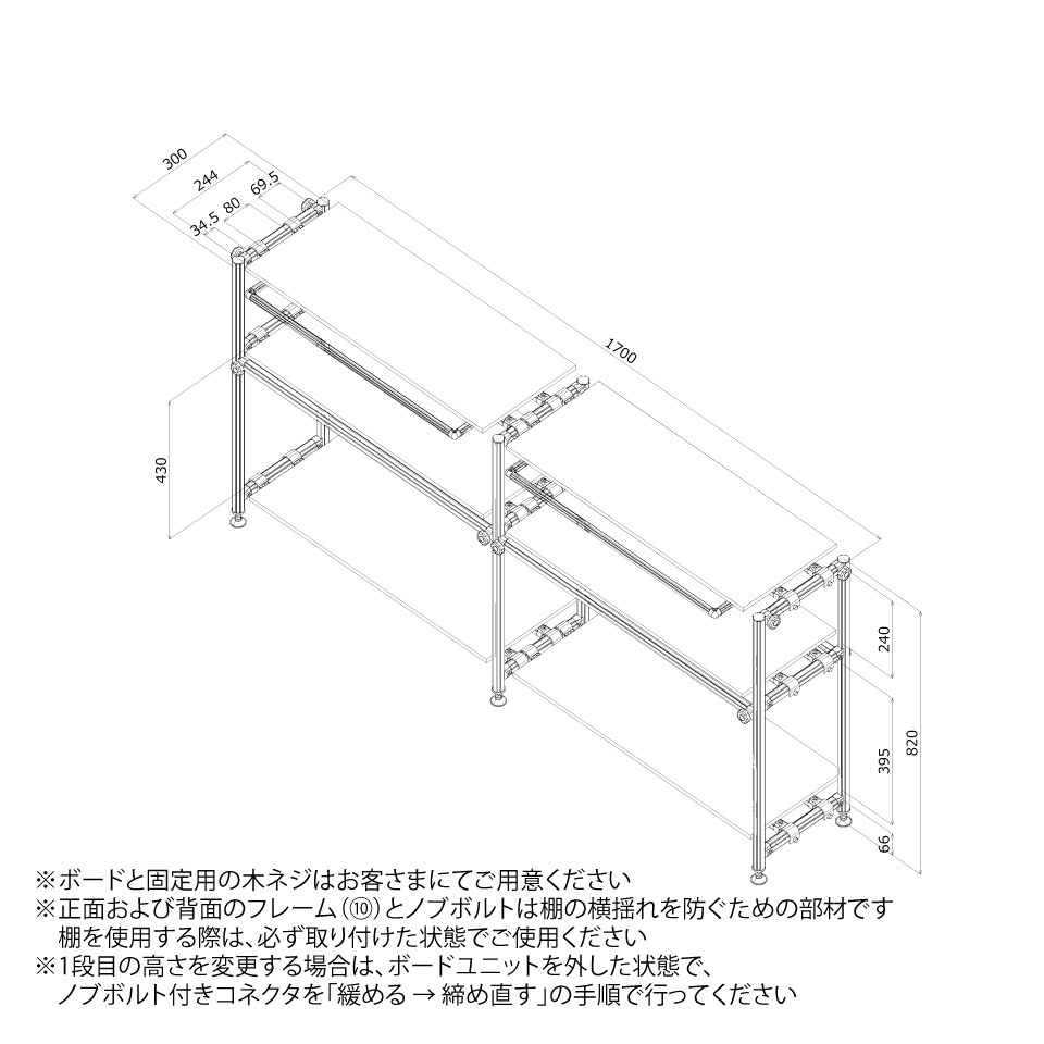 テクニカルサポートをご利用いただいたお客さまのアイデアです。アジャスタ付きのため屋外でも水平に設置でき、ノブボルト仕様により工具なしで組み立て可能です。天板の取っ手にフックを付ければ、吊り下げ収納としても使えます。