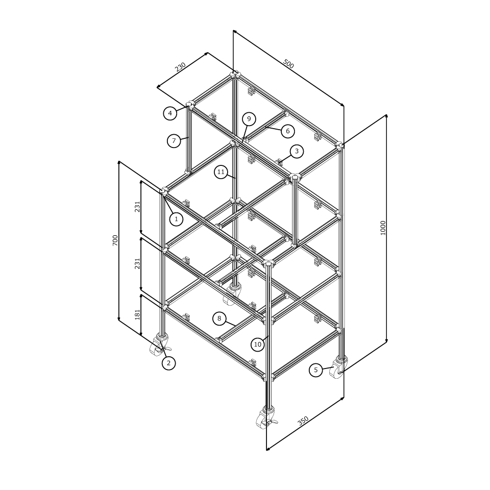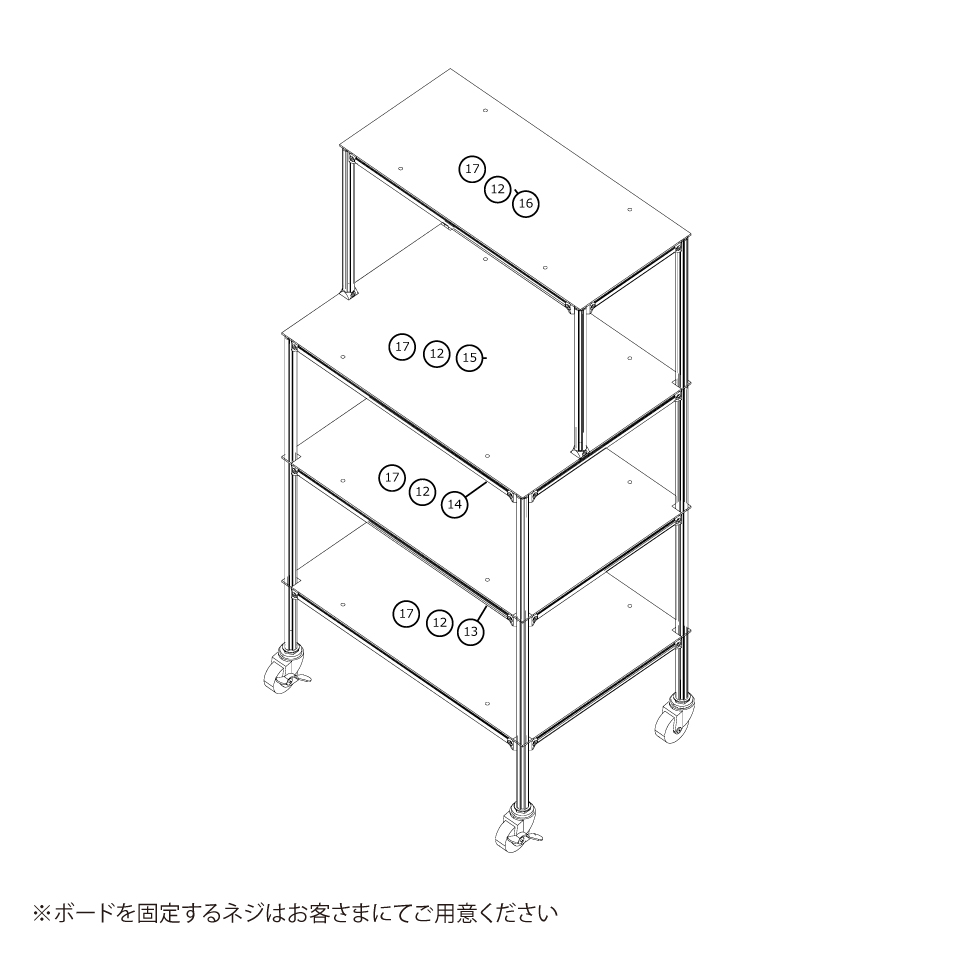 テクニカルサポートをご利用いただいたお客さまのアイデアです。バイク部品を整理するための棚です。脚にはブレーキ付きキャスターを使用しているため、ラックの移動もスムーズに行えます。