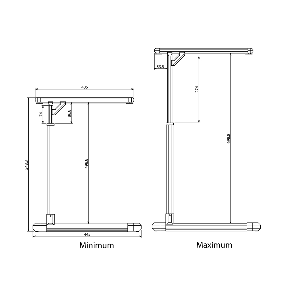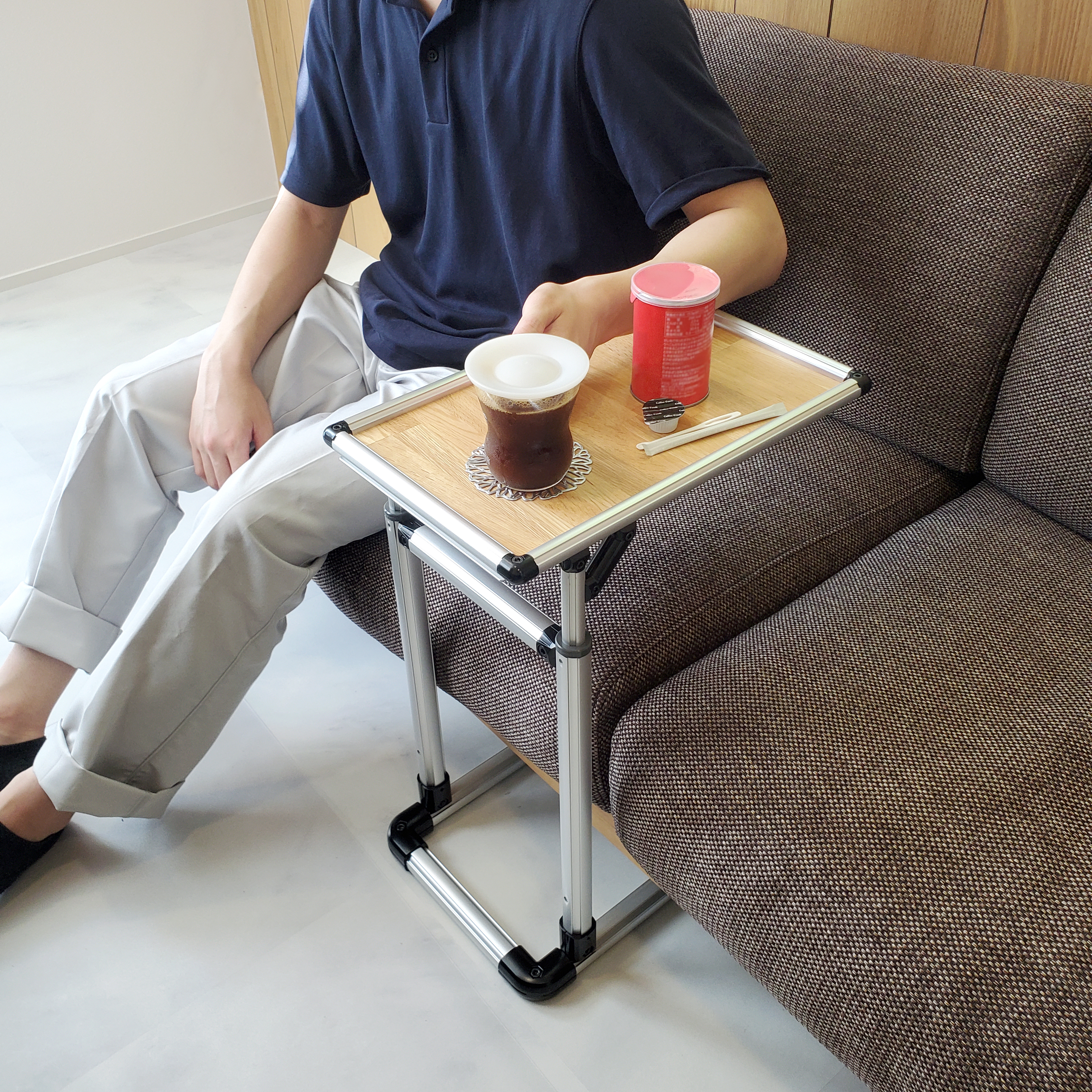 伸縮フレームを活用し、高さを20mm刻みで細かく調整できるサイドテーブルです。ソファ等に合わせて最適な高さで使用でき、最下段まで下げることでコンパクトに収納できます。