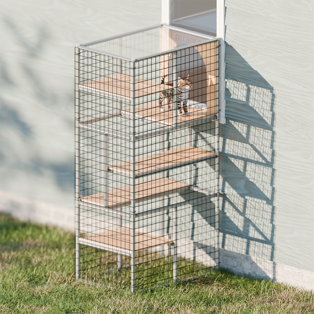 テクニカルサポートをご利用いただいたお客さまのアイデアです。猫ちゃんが屋内から自由に出入りできる小窓付きです。外の空気を感じながら、日向ぼっこや休憩ができる5段のステップを備えています。