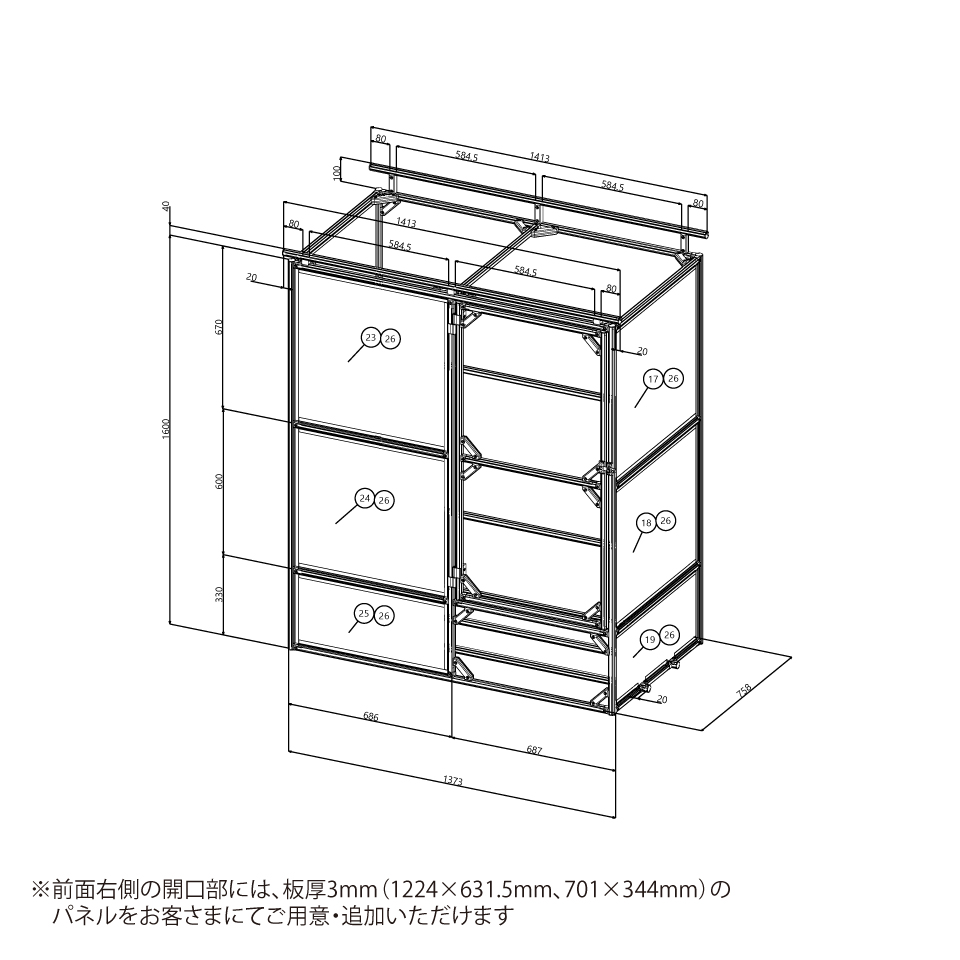 ※前面右側の開口部には、板厚3mm(1224×631.5mm、701×344mm)の
