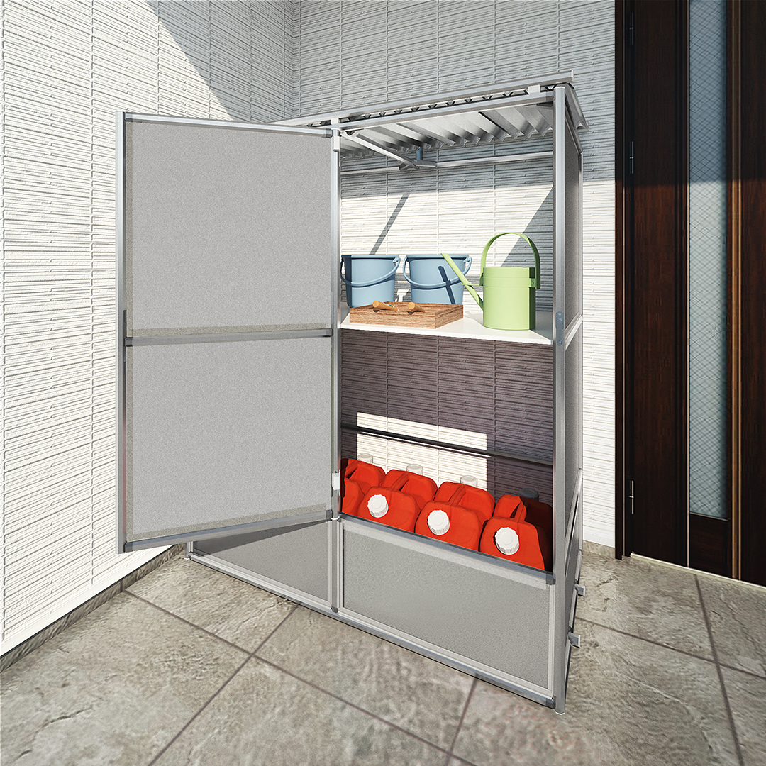 テクニカルサポートをご利用いただいたお客さまのアイデアです。灯油タンク用の収納ボックスで、屋外設置時の日よけ・雨よけとして活用できます。前面に扉付きで給油がしやすく、玄関周りをすっきり保てます。