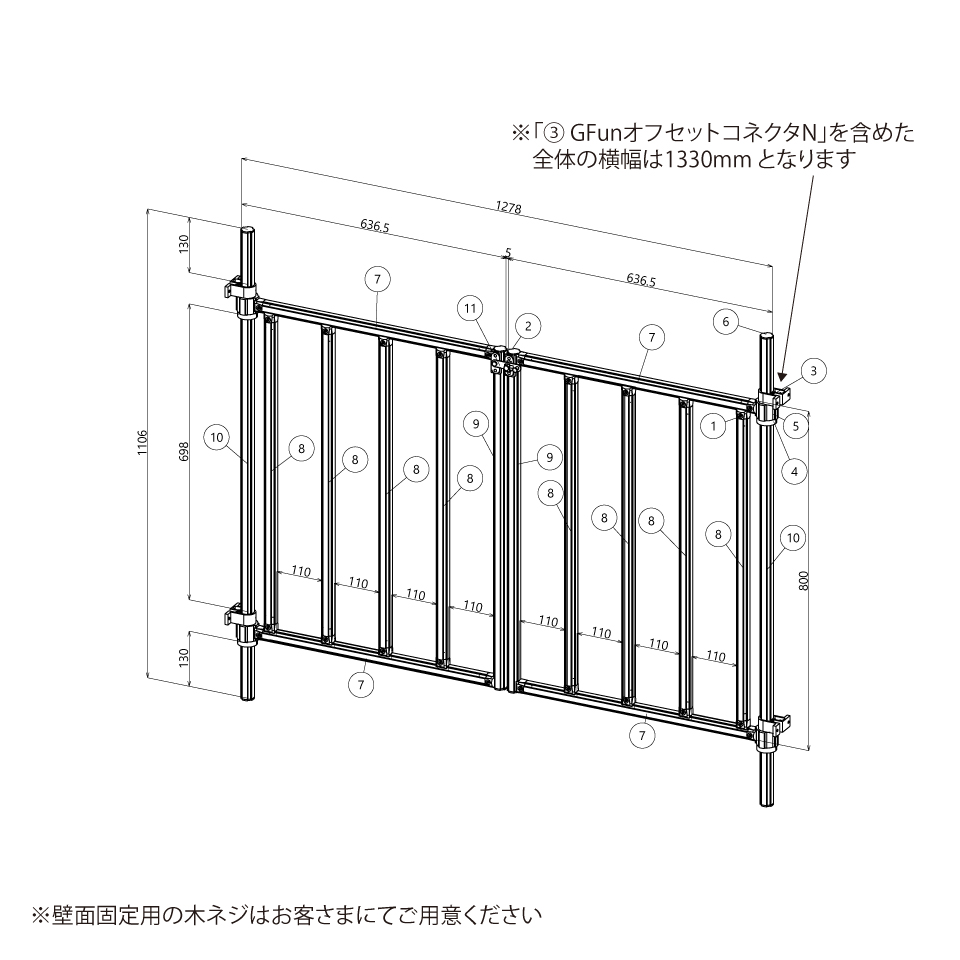テクニカルサポートをご利用いただいたお客さまのアイデアです。開口を大きく確保できる両開き仕様。建物の外観になじむシンプルなフレームデザインで、美観と使い勝手を両立します。設置場所のサイズに合わせたカスタマイズも可能です。